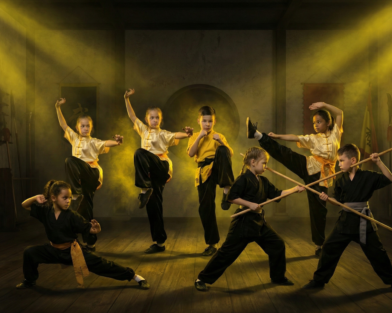 Students start with fundamental techniques that focus on posture, balance, movement control, and basic forms.