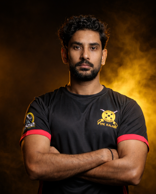 Beyond Kalaripayattu, Revikumar S holds multiple martial arts certifications, including Karate – 1st Dan, and is a qualified Kung Fu Trainer and Kickboxing Trainer. This multi-disciplinary background allows him to design well-rounded training programs that enhance strength, flexibility, coordination, and combat readiness.